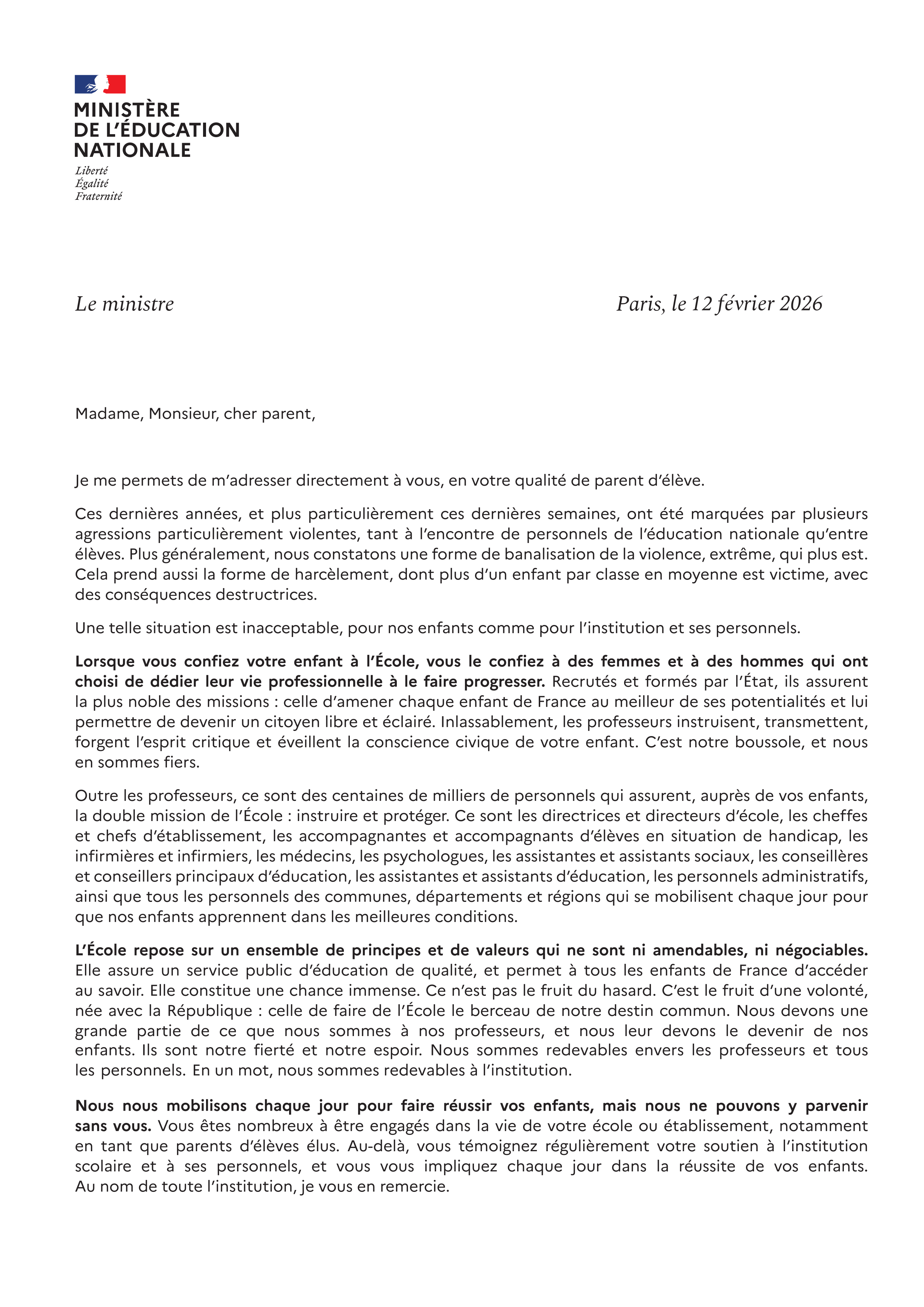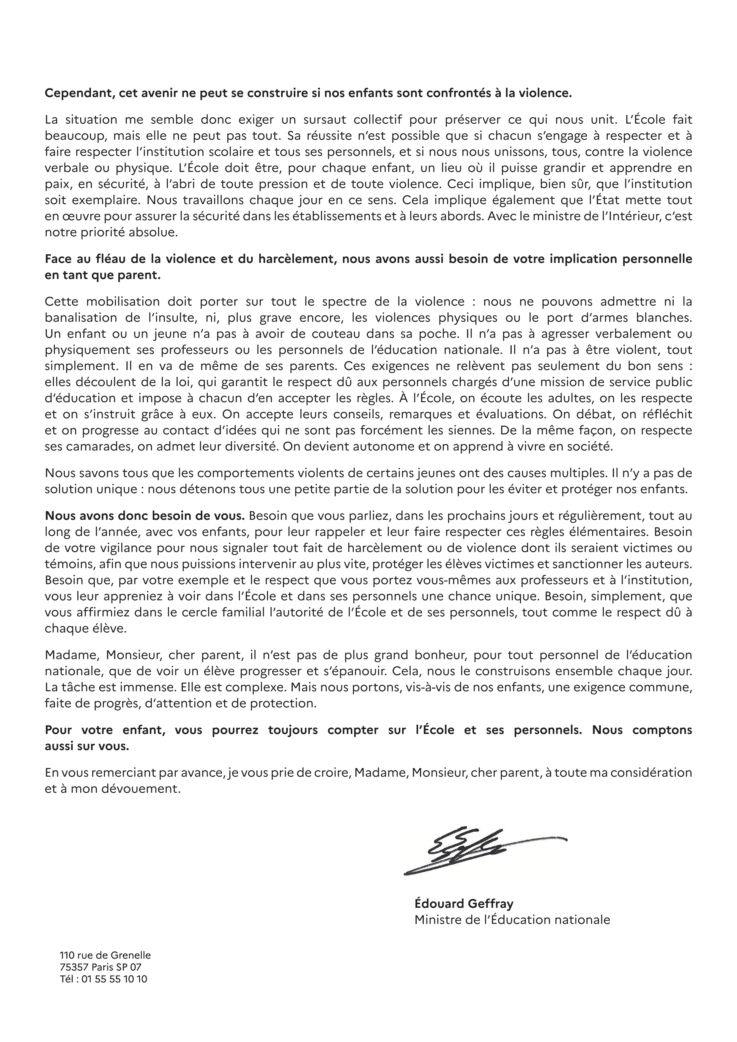 Lettre de M. le ministre de l'Éducation nationale au parents d'élèves